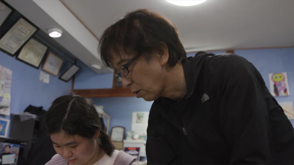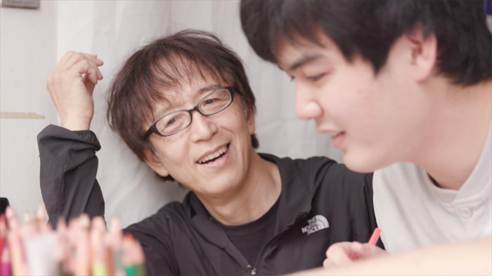 月に一度、地元の特別支援学校の卒業生たちが集まり、思い思いに絵を描いている。指導するのは学校で彼らに美術を教えていた松本進さん。