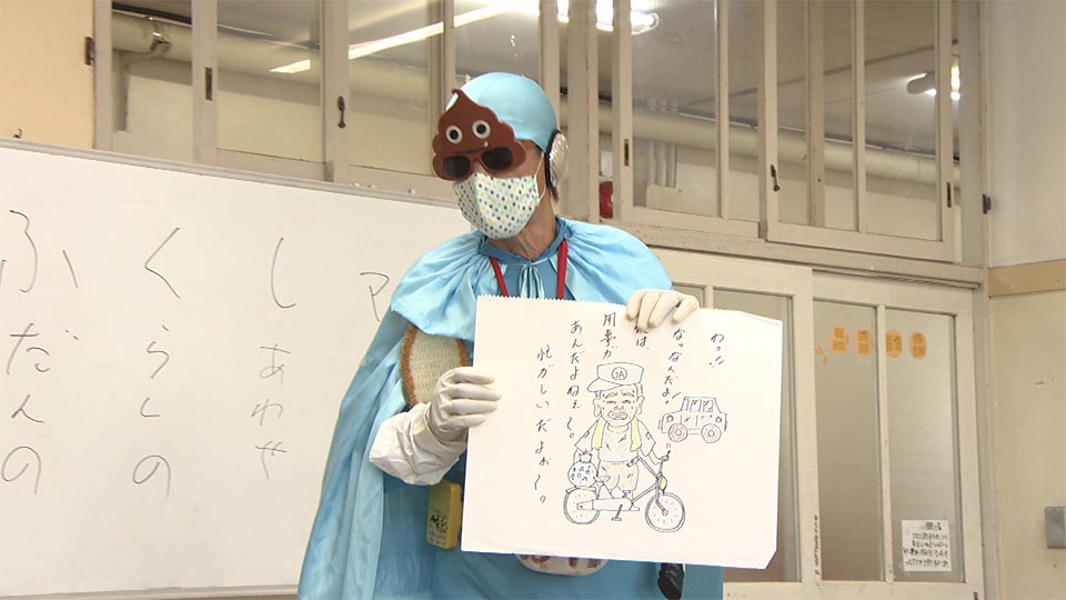 石津さんは、定期的に地元の小・中・高等学校で「福祉」について講演会を開いている。その際は奇抜な格好をした「ふくしマン」として活動。